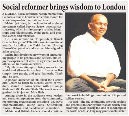 Bunch of local press reported on various events, lots of new friendships were cultivated, many new projects (including Mita, who's starting an Awakin Circle in Harrow, and Mike, who's exploring another Karma Kitchen location!) and organic cross-pollination emerged (like some folks from Austria will soon be coming to India for a retreat!) Thank you, all!